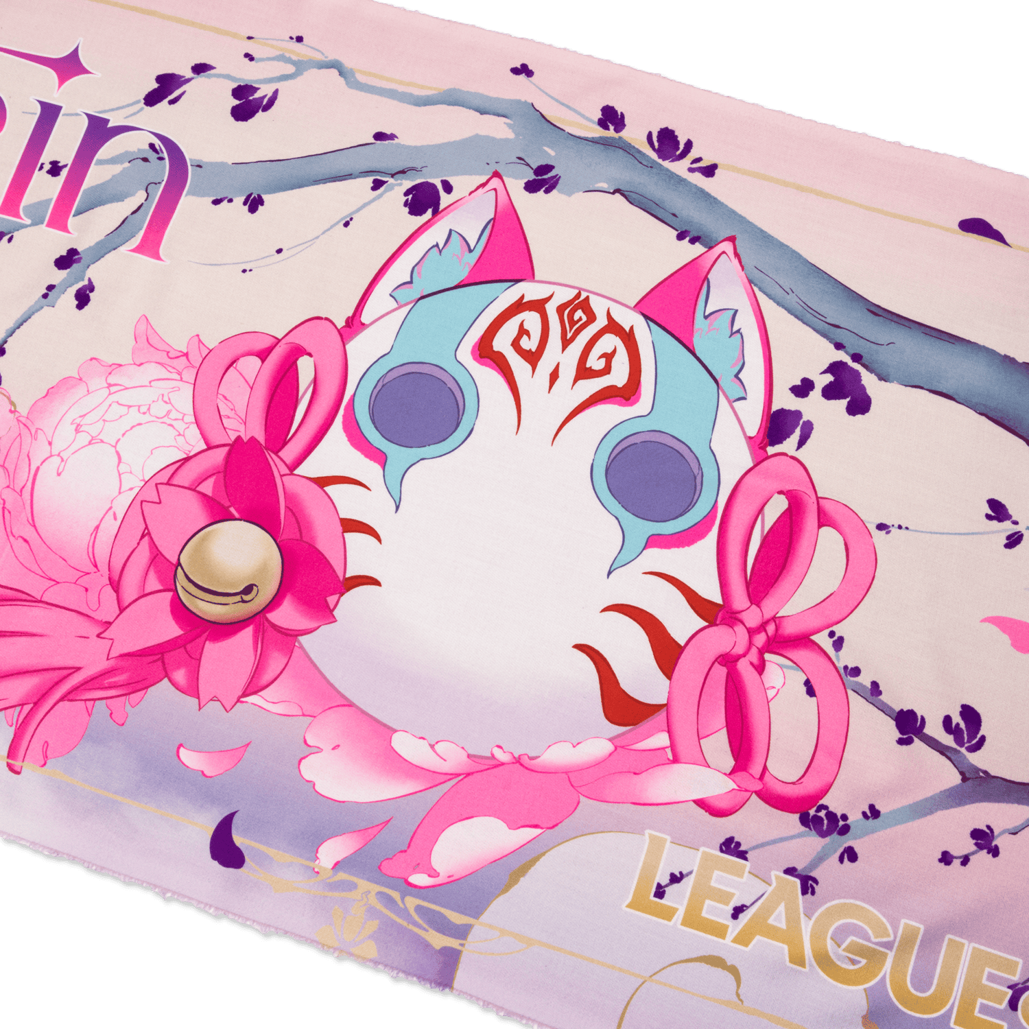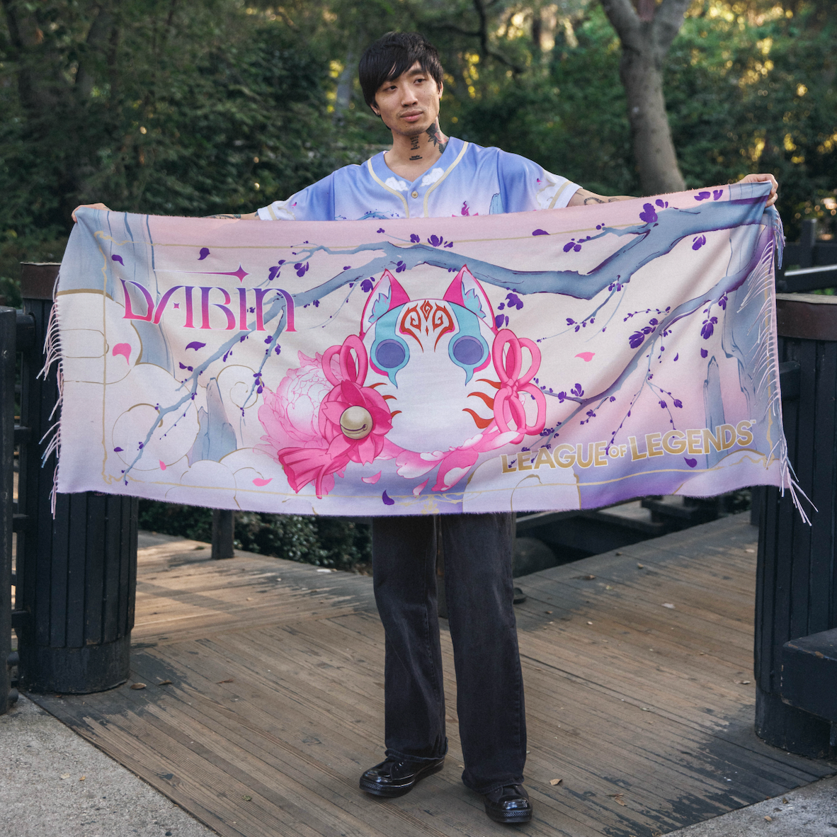 This pashmina features a fully custom illustration of a Dabin Harold mask rendition in the style of Spirit Blossom, along with Dabin and League of Legends logos.